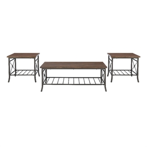 Linon Anders 3 Pc Metal and Wood Occasional Table Set Plank Style Tops in Brown