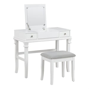 Linon Angela Wood Vanity & Padded Beige Stool 2 Drawers Flip Up Mirror in White
